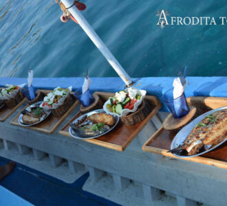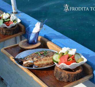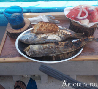 – Вкуснейший обед: дикая дорада на мангале, греческий салат с деревенским сыром, фрукты ( виноград, арбуз) и конечно же все виды напитков, в том числе и алкогольных. Ваш улов тоже будет приготовлен на мангале по вашему желанию.